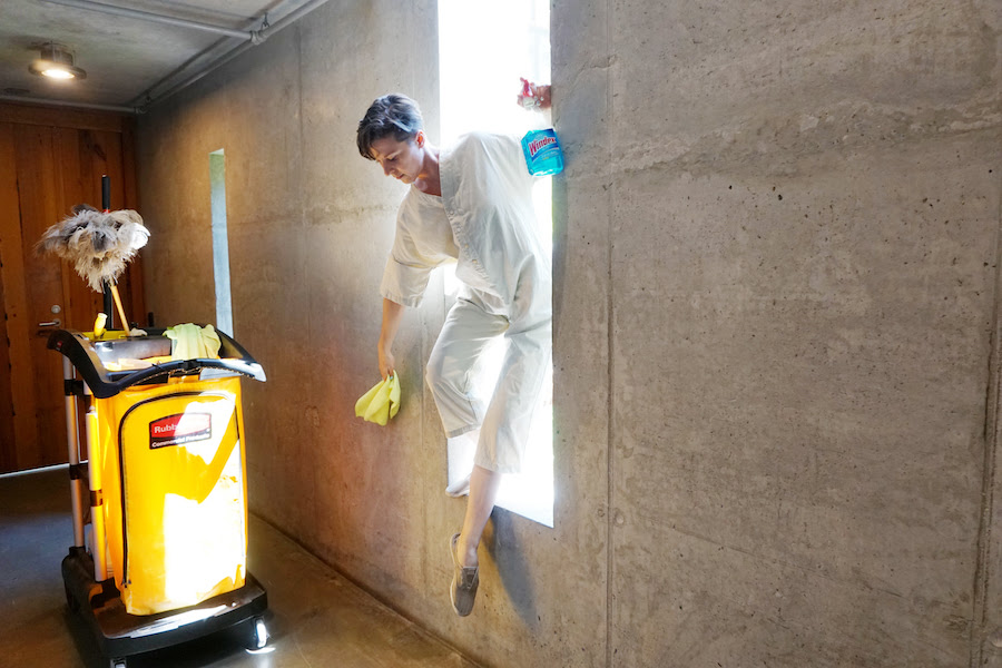 “A film work of cinematic scale, Cleaner traces the creative awakening of a maintenance worker. Her movements are framed within the routines of manual labor yet set against the work environment of the tech economy. The film, shot on location at the headquarters of Kickstarter, juxtaposes the physicality of traditional labor with the abstraction of technological work through its use of soaring camera work, precise framing, and choreography inspired by every day movement. This fractured narrative exposes the tight grip of corporate social space and the precarity inherent in all forms of work today.”